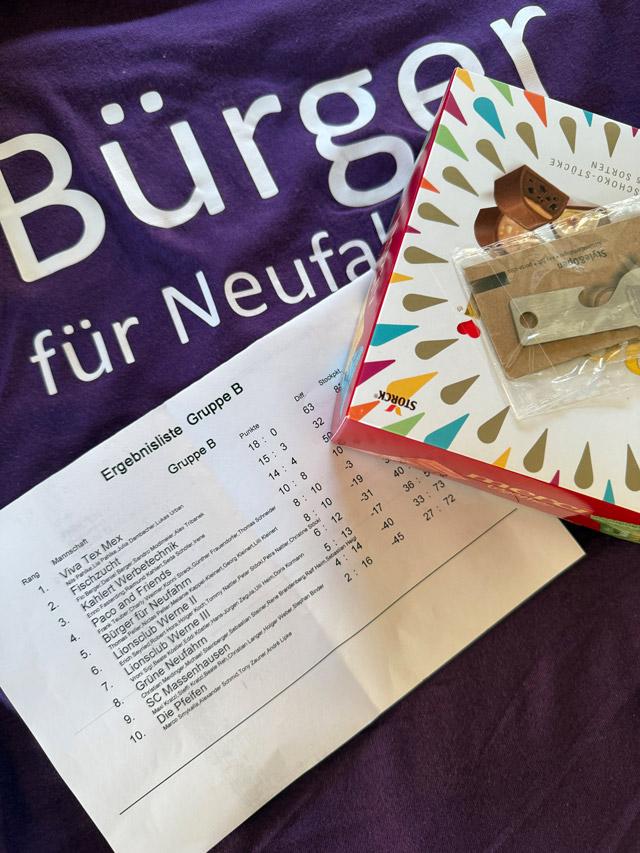 Gleich im ersten Spiel demonstrierte das Team eine beeindruckende Mischung aus Taktik, Teamgeist und trotz gelegentlicher Orientierungslosigkeit auf dem Spielfeld gewannen wir die Partie haushoch. Damit war klar: Die Bürger für Neufahrn meinten es ernst. Oder zumindest halb ernst – je nachdem, wie gut der letzte Stoß war. Zwischenzeitlich mussten wir zwar kurz das Regelwerk googeln – aber wir haben immer fair und meistens geradeausgespielt.