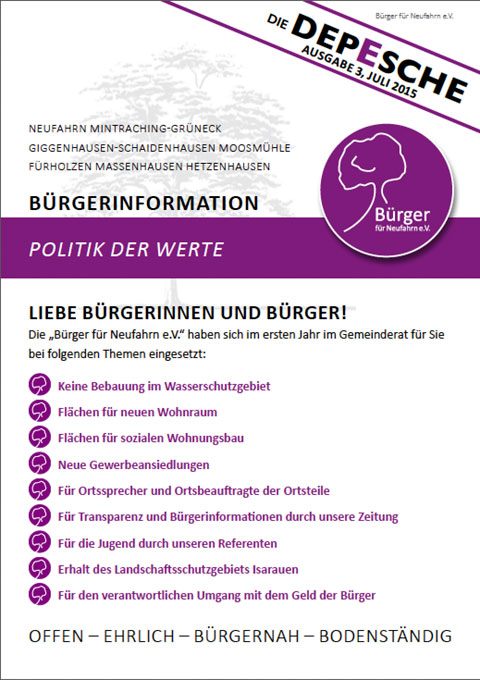 In der dritten Ausgabe finden Sie dieses Mal unter anderem Berichte aus dem Gemeinderat zur Erweiterung des Gewerbegebiets in Mintraching an den Isarauen, ein Bericht des Jugendreferenten und ein Resümee unserer Arbeit im ersten Jahr der Gemeinderatsarbeit.