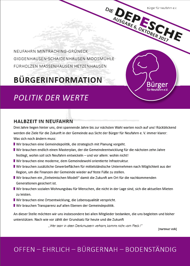 In der aktuellen DepEsche beschäftigen wir uns mit den Bürgerversammlungen, dem neuen Bürgermeiseter-Dienstwagen, der Skydiving-Anlage in Mintraching sowie weiteren aktuellen Themen rund um die Gemeinde.